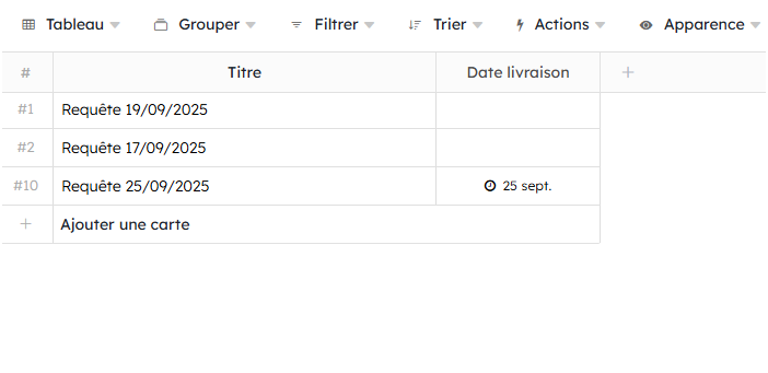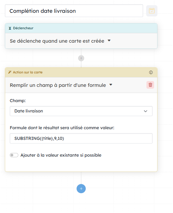 Dans cet exemple, à chaque fois qu’une carte est créée, le champ" Date livraison" soit complété avec la date présente dans le titre :